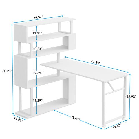 Rotating Desk with 5-Tier Bookshelf, Reversible Computer Desk with Wheels