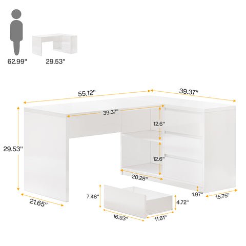 L-Shaped Desk with Plenty of Space – This white corner desk measures 55.12″ W x 39.37″ D x 29.53″ H, offering a large workspace. It includes 2 open shelves for office supplies and 3 drawers for documents and personal items.
